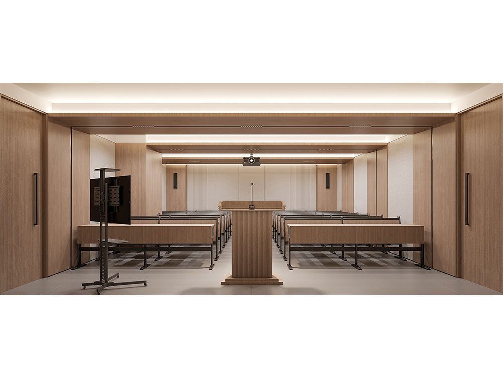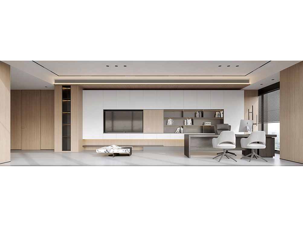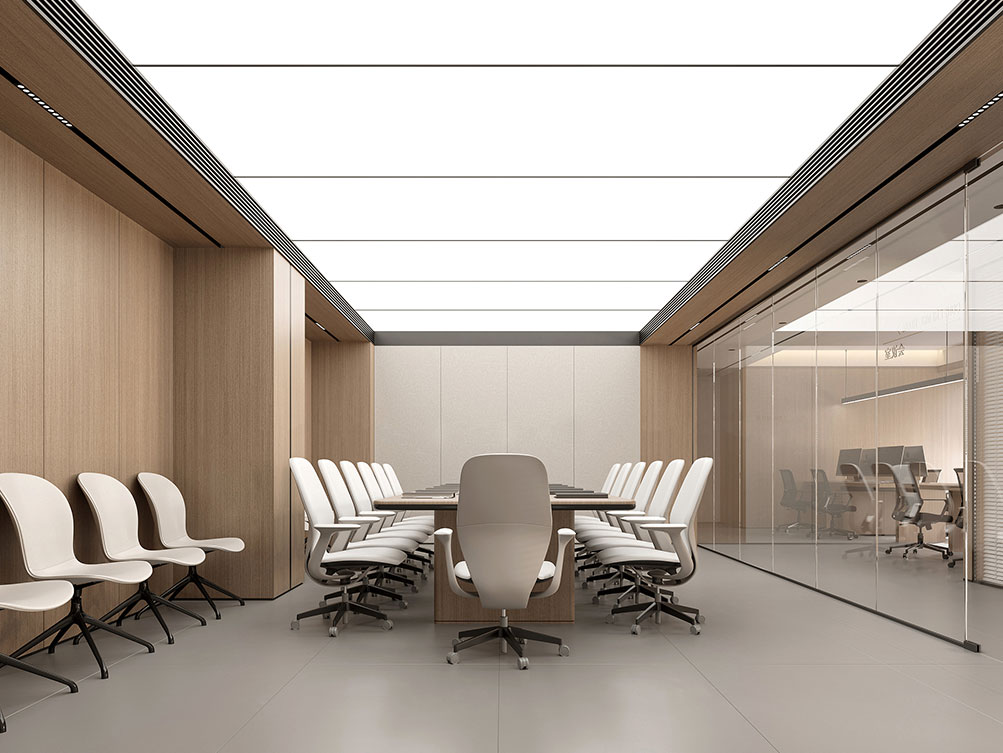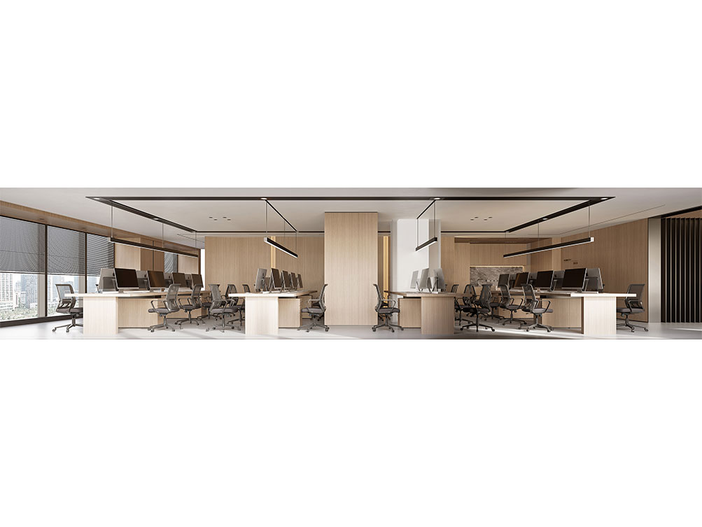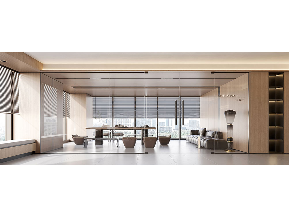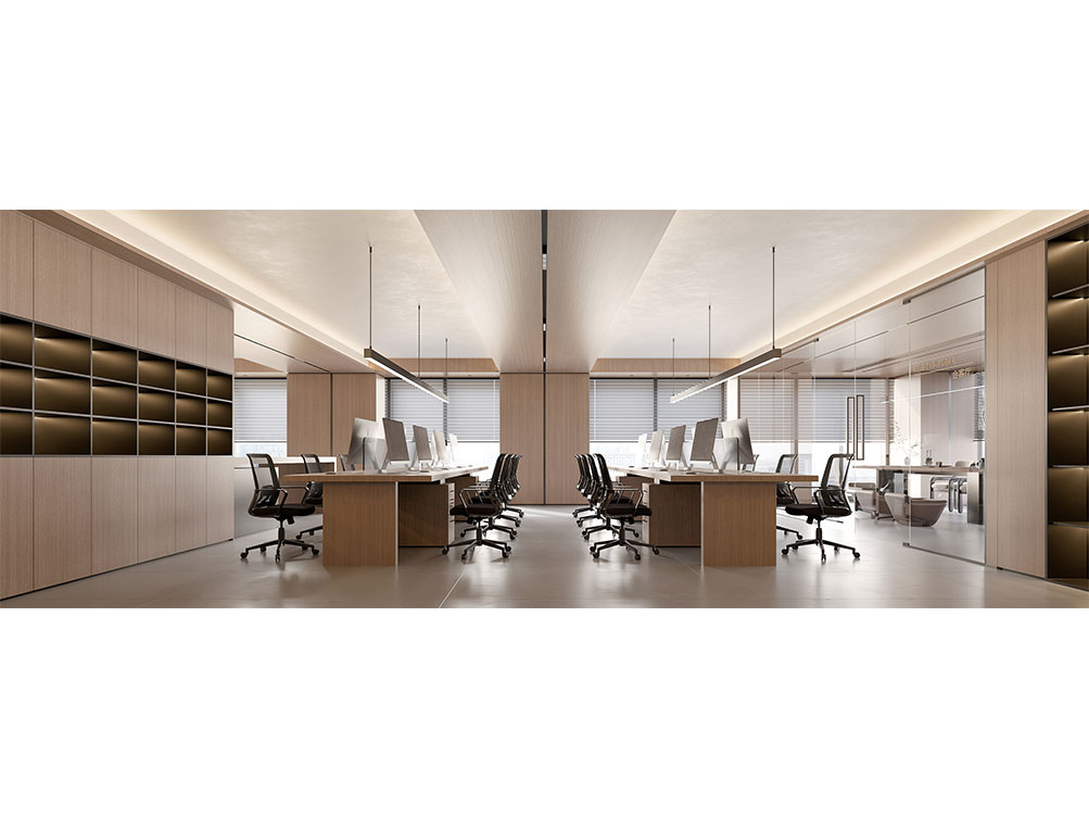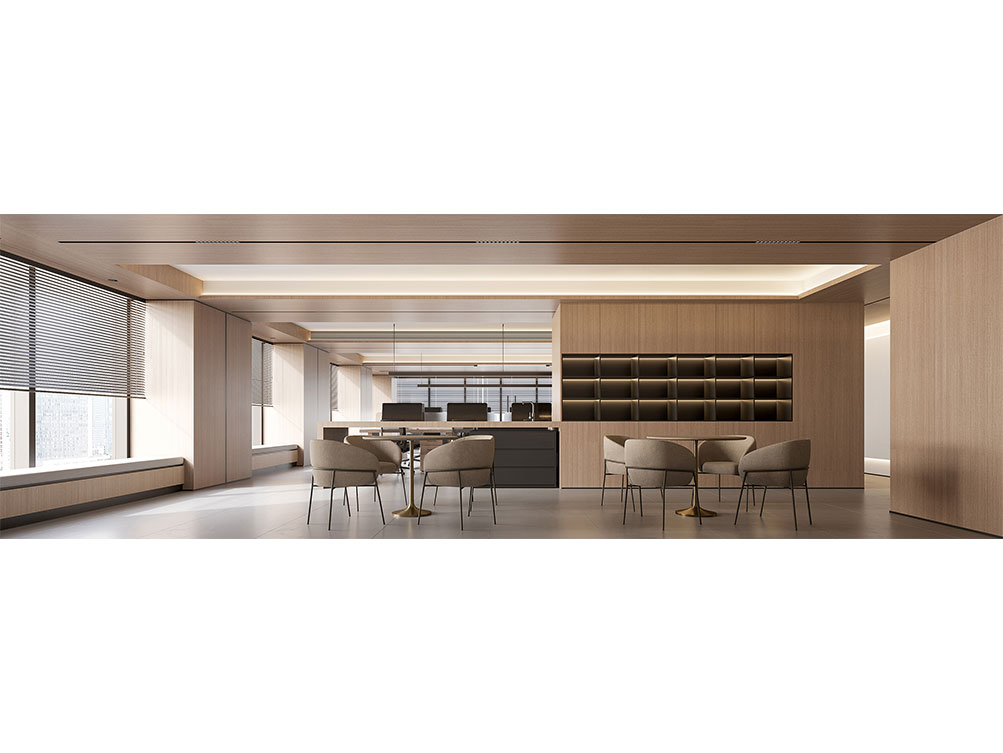 設計理念: 濟南奧克斯中心辦公室以溫潤木調為主線,搭配淺灰地面與嵌入式燈光,打造出濟南辦公室裝修中標志性的簡奢氛圍。開放式長桌適配團隊協作,玻璃隔斷既保障通透又劃分功能區,嵌入式柜體兼顧收納與美學,結合柔光設計,契合濟南商務空間 “實用 + 質感” 的裝修需求,是濟南辦公室裝修中現代高效風的典型呈現。